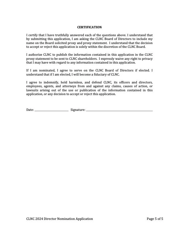 Attention CLNC Shareholders! Please see the corrected documents regarding the 2024 Board of Directors Election.